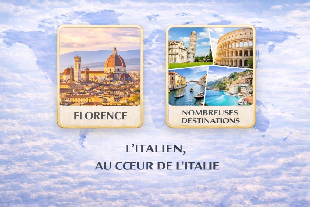 Apprenez l’italien là où il se parle naturellement, au cœur de villes emblématiques comme Florence et d’autres destinations au cœur de l’Italie, entre patrimoine, traditions et vie locale.